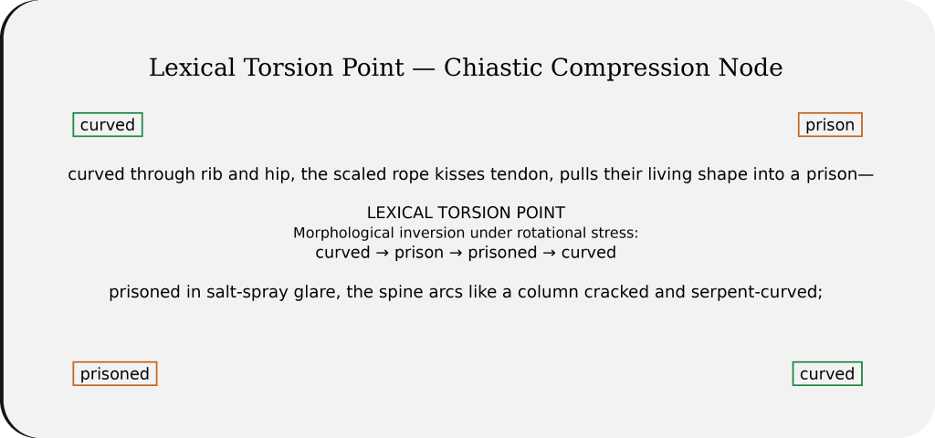 Musical analogues sharpened this intuition. In Britten’s Passacaglia from Peter Grimes, a fixed ground bass supports escalating psychological tension; the pattern remains constant while affect intensifies. Górecki’s Symphony No. 3 achieves similar force through austere repetition and incremental variation. In both cases, recurrence generates deepening rather than release. The mirrored sestina seeks comparable conditions in language: intensification without lexical proliferation. For that reason, it cannot accommodate an envoi. The traditional sestina gathers its terminal words into final compression; the mirrored structure must refuse that seal. Closure would interrupt symmetry. Instead, the poem reaches a pivot sixain and proceeds under reversed authority, preserving rotation while altering semantic charge. Meaning is not replaced but recontextualized.