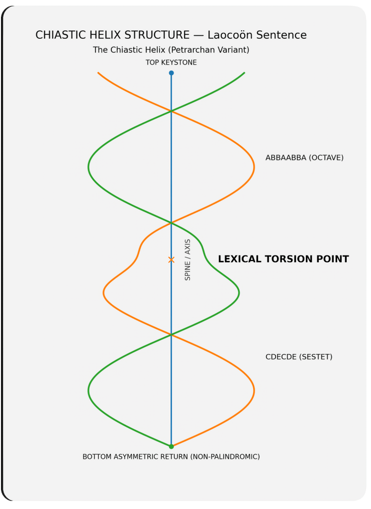 The sonnet, which I have elsewhere described as a judicial engine — a compact mechanism for testing argument, memory, and consequence — becomes particularly suited to procedural experimentation. Its internal logic can be recombined with other recursive or architectonic systems. In the Sestonnet, the sonnet’s dialectical progression is fused with the sestina’s rotational terminal-word governance, producing a hybrid structure in which linear adjudication and cyclical recurrence operate simultaneously. In the Ghost Caudate Sonnet, terminal rhyme patterns derived from Shakespearean precedent intersect with Petrarchan and Spenserian containment strategies, while additional constraints on initial and medial lexical positions distribute structural obligation across the poem’s full surface. The caudate thus emerges not as an appended tail but as latent architecture embedded within the poem’s rotational field.